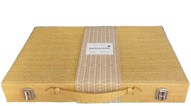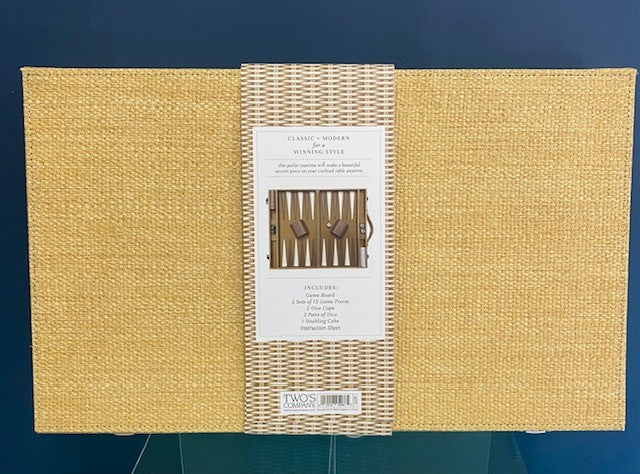 Two's Company Backgammon Complete Set. Grass Cloth Textured Cover. Includes: Game Board, 2 Sets of 15 Game Pieces, 2 Dice Cups, 2 Pairs of Dice, 1 Doubling Cube, Instruction Sheet